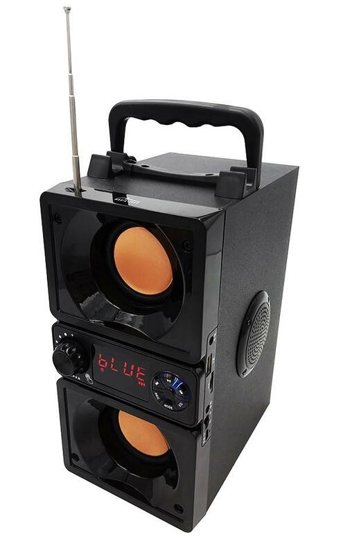 - Pozostałe parametry Kompaktowy głośnik Bluetooth stereo z wbudowanym wooferem Protokoły: A2DP, AVRCP Radio FM z automatycznym wyszukiwaniem stacji 87,6-108MHz Odtwarzacz MP3 Obsługa kart micro SD oraz nośników USB Wbudowany akumulator litowo-jonowy - do 7 godzin pracy bez ładowania System DBD *) wydłużenie czasu pracy przez podłączenie 2go akumulatora (dodatkowy zakup) Moc: RMS 15W, PMPO 650W 2 x 3 głośnik basowy, 2 x 2 głośniki średniotonowe Kolorowa iluminacja LED Podstawka do smartfona Wyświetlacz informacyjny LED Antena teleskopowa Drewniana obudowa