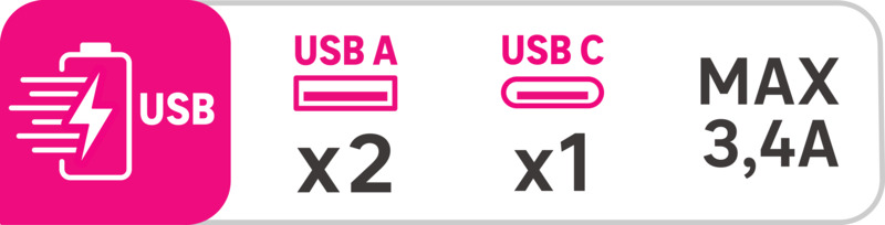 3 PORTY USB 2*(USBA)+1*(USBC) WEJŚCIE: AC-100~240 V, 50-60 Hz MOC: 17 W CAŁKOWITA WYJŚCIE: 3,4 A